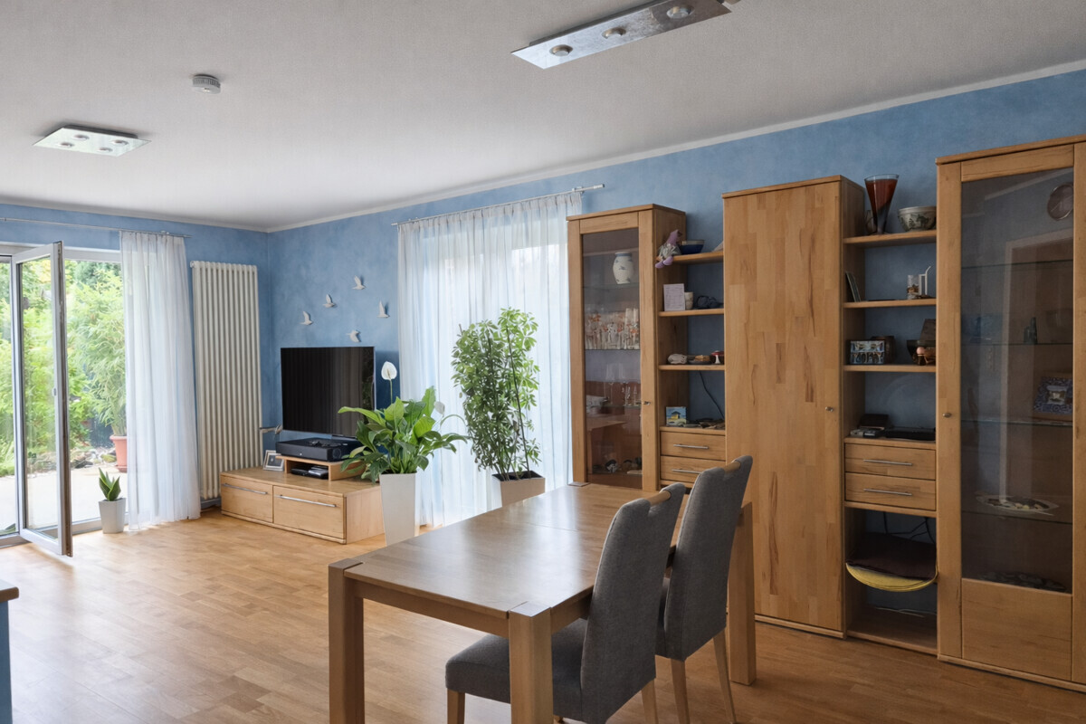 Der großzügige Wohn- und Essbereich bildet das Herzstück der Wohnung und bietet direkten Zugang zur Terrasse sowie in den liebevoll angelegten Garten – ideal zum Entspannen. Die Wohnräume sind mit einem hochwertigen Parkett ausgestattet. Insgesamt stehen Ihnen drei Schlafzimmer zur Verfügung, sodass sich die Wohnung hervorragend für Familien, Paare mit Homeoffice oder alle eignet, die zusätzlichen Raum benötigen. Das Badezimmer wurde 2018 modernisiert. Die Küche stammt aus 2016 und soll übernommen werden. Gewisse Möbelstücke können ebenfalls nach Absprache übernommen werden, so auch eine perfekt angepasste Garderobe. Zur Wohnung gehören außerdem ein eigener Kellerraum sowie eine gemeinschaftliche Waschküche. Praktisch: Über den Garten besteht ein Zugang zur Garage; der Stellplatz vor der Garage darf ebenfalls genutzt werden.