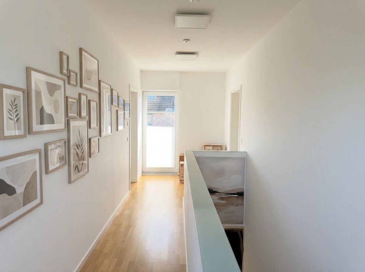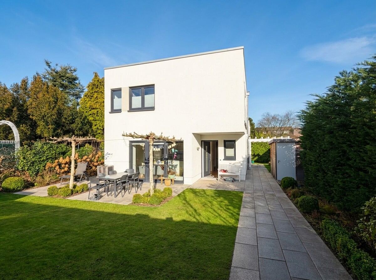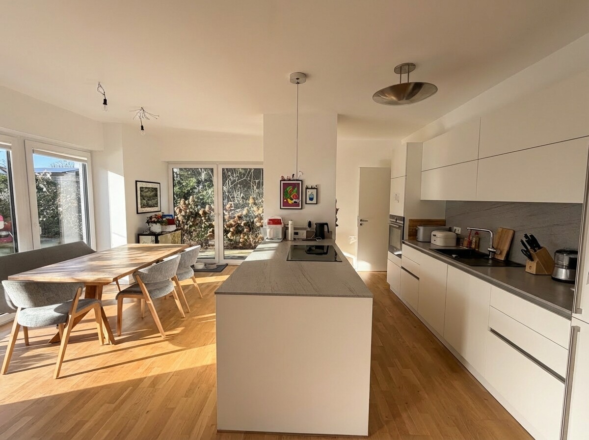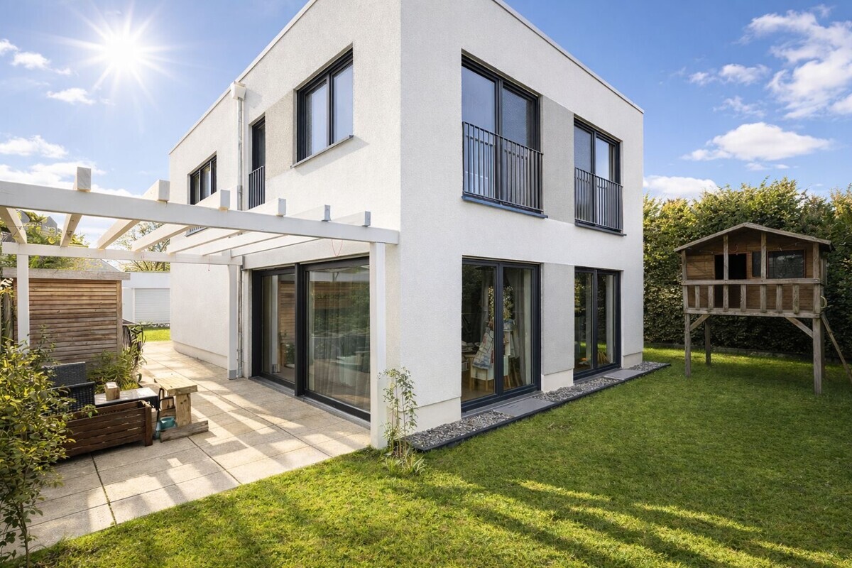 Dieses neuwertige Einfamilienhaus aus dem Baujahr 2018 in Neuss-Uedesheim überzeugt durch moderne Architektur, eine hochwertige Ausstattung und ein durchdachtes, familienfreundliches Raumkonzept auf ca. 163 m² Wohnfläche. Das Haus steht auf einem ca. 400 m² großen Grundstück, ist voll unterkellert und wird aufgrund eines Auslandsaufenthalts zunächst befristet bis zum 31.01.2029 vermietet. Bei längerem Aufenthalt besteht die Möglichkeit einer entsprechenden Verlängerung. Bereits beim Betreten empfängt Sie ein großzügiger Eingangsbereich mit einem großen, maßgefertigten Einbau-Kleider- und Schuhschrank. Im Erdgeschoss erwartet Sie ein modernes Wohnambiente mit Fußbodenheizung, bodentiefen Fenstern, Parkettböden in allen Räumen sowie glatt verputzten Wänden. Herzstück ist die hochwertige Einbauküche mit angrenzendem Essbereich. Das geräumige Wohnzimmer überzeugt durch große Fensterflächen und eine helle, freundliche Atmosphäre. Besonders attraktiv: Von sämtlichen Räumen im Erdgeschoss besteht direkter Zugang in den umlaufenden Garten, der somit ganztägig sonnige Rückzugsorte bietet. Ein Gartenhaus sorgt für praktischen Stauraum, während ein separates Spielhaus den Außenbereich zum perfekten Platz für Kinder macht. Im Obergeschoss stehen insgesamt drei Schlafzimmer zur Verfügung: zwei gleich große Zimmer sowie ein sehr großzügiges Hauptschlafzimmer mit großem Einbauschrank und Bad en suite. Ergänzt wird die Etage durch ein weiteres Gäste- oder Kinderbad. Ein separates Gäste-WC im Erdgeschoss rundet das Raumangebot ab. Der Keller umfasst zwei sehr große Räume, die vielseitig genutzt werden können. Diverse Einrichtungsgegenstände können nach Absprache erworben oder gemietet werden. Dieses Haus eignet sich ideal für Familien die modernes Wohnen in ruhiger Lage und guten Anbindungen wertschätzen.
